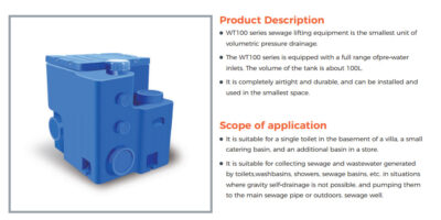 • Wt seriyali kanalizatsiya ko'tarish uskunalari mos keladi hojatxonalar, lavabolar, dushlardan hosil bo'lgan oqava suvlarni yig'ish. kanalizatsiya havzalari, vannalar, kir yuvish mashinalari va boshqalar. drenaj holatlari asosiy kanalizatsiya trubasiga pompalanadi yoki tashqi kanalizatsiya qudug'i. • Wt 180 seriyali suvni oldindan etkazib berish moslamalarining to'liq to'plamiga ega. kirishlar. Tankning hajmi taxminan 180 litrni tashkil qiladi. • U to'liq muhrlangan va bardoshlidir. va turli xil narsalar bilan uchrashishi mumkin o'rnatish shartlari. Qo'llash sohasi • Bungalovlar, villalar podvallari (kir yuvish xonasi bilan xonalar), klublar, kichik jamoat hojatxonalari va boshqalar. Ishlash parametrlari • O'rnatilgan kesish pompasi • Korroziyaga chidamli polietilen quti. • Quti oyoq interfeysi bilan jihozlangan. • To'liq muhrlangan, hidsiz • Suv nasosining muftali ulanishi, texnik xizmat ko'rsatish oson. • Bir nechta suv olish moslamalari osongina ulanadi • O'rnatilgan zanglamaydigan po'latdan yasalgan nazorat valfi. • Quti oyoq interfeysi bilan jihozlangan. • Qutining o'lchami kichik, o'rnatish oson. • LCD displeyli maxsus boshqaruv blokini qo'llab-quvvatlash.