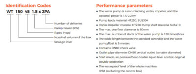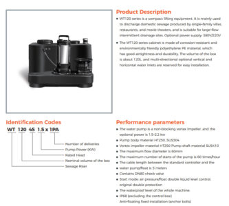 • Wt seriyali kanalizatsiya ko'tarish uskunalari mos keladi hojatxonalar, lavabolar, dushlardan hosil bo'lgan oqava suvlarni yig'ish. kanalizatsiya havzalari, vannalar, kir yuvish mashinalari va boshqalar. drenaj holatlari asosiy kanalizatsiya trubasiga pompalanadi yoki tashqi kanalizatsiya qudug'i. • Wt 180 seriyali suvni oldindan etkazib berish moslamalarining to'liq to'plamiga ega. kirishlar. Tankning hajmi taxminan 180 litrni tashkil qiladi. • U to'liq muhrlangan va bardoshlidir. va turli xil narsalar bilan uchrashishi mumkin o'rnatish shartlari. Qo'llash sohasi • Bungalovlar, villalar podvallari (kir yuvish xonasi bilan xonalar), klublar, kichik jamoat hojatxonalari va boshqalar. Ishlash parametrlari • O'rnatilgan kesish pompasi • Korroziyaga chidamli polietilen quti. • Quti oyoq interfeysi bilan jihozlangan. • To'liq muhrlangan, hidsiz • Suv nasosining muftali ulanishi, texnik xizmat ko'rsatish oson. • Bir nechta suv olish moslamalari osongina ulanadi • O'rnatilgan zanglamaydigan po'latdan yasalgan nazorat valfi. • Quti oyoq interfeysi bilan jihozlangan. • Qutining o'lchami kichik, o'rnatish oson. • LCD displeyli maxsus boshqaruv blokini qo'llab-quvvatlash.
