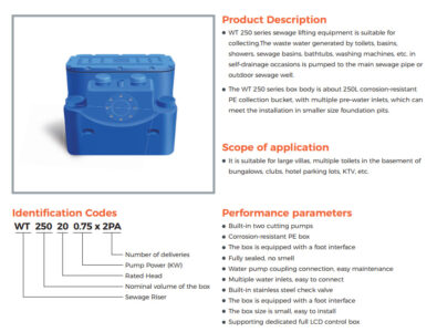 • Wt seriyali kanalizatsiya ko'tarish uskunalari mos keladi hojatxonalar, lavabolar, dushlardan hosil bo'lgan oqava suvlarni yig'ish. kanalizatsiya havzalari, vannalar, kir yuvish mashinalari va boshqalar. drenaj holatlari asosiy kanalizatsiya trubasiga pompalanadi yoki tashqi kanalizatsiya qudug'i. • Wt 180 seriyali suvni oldindan etkazib berish moslamalarining to'liq to'plamiga ega. kirishlar. Tankning hajmi taxminan 180 litrni tashkil qiladi. • U to'liq muhrlangan va bardoshlidir. va turli xil narsalar bilan uchrashishi mumkin o'rnatish shartlari. Qo'llash sohasi • Bungalovlar, villalar podvallari (kir yuvish xonasi bilan xonalar), klublar, kichik jamoat hojatxonalari va boshqalar. Ishlash parametrlari • O'rnatilgan kesish pompasi • Korroziyaga chidamli polietilen quti. • Quti oyoq interfeysi bilan jihozlangan. • To'liq muhrlangan, hidsiz • Suv nasosining muftali ulanishi, texnik xizmat ko'rsatish oson. • Bir nechta suv olish moslamalari osongina ulanadi • O'rnatilgan zanglamaydigan po'latdan yasalgan nazorat valfi. • Quti oyoq interfeysi bilan jihozlangan. • Qutining o'lchami kichik, o'rnatish oson. • LCD displeyli maxsus boshqaruv blokini qo'llab-quvvatlash.